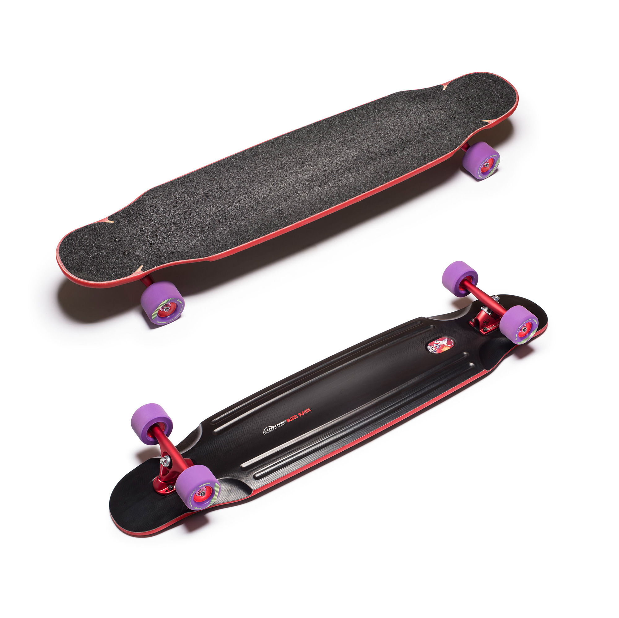 But then people began to hunger- other companies started to come out with Chubby Unicorn-esque constructions of various plastics and urethanes and light wood cores, and people started to ask, “Loaded, where’s the Chubby Unicorn? Wherefore has’t thee f’rsaken us?!” And the dudes and dudettes at Loaded smirked, because Loaded never leaves the scene behind. And lo and behold, the Chubby Blood Slayer- a gory, elevated version of the fat, happy-go-lucky Chubby Unicorn. This time in red and black! (It’s the new blue and white.)