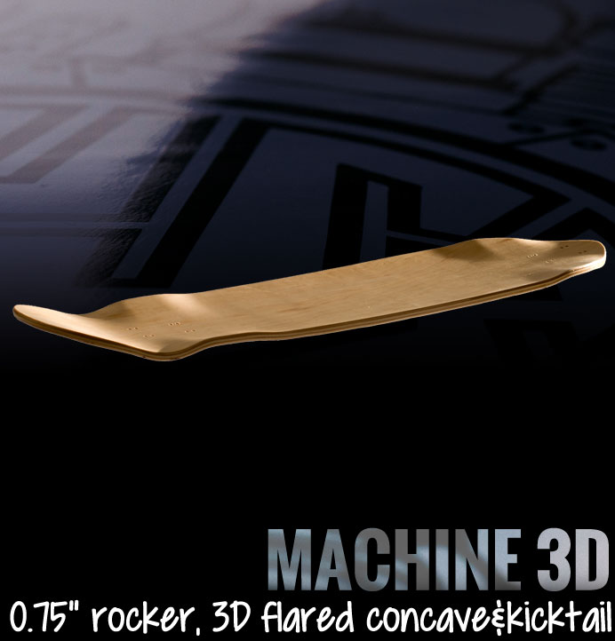 The 3D Machine features a mellow radial/rocker combination concave in the middle of the deck that’s comfortable for your feet when you’re pushing to a spot, but also steep enough to lock you in for tucking and other related shenanigans. The concave also features blocky, geometrically-shaped wheel flares that are incredibly useful for creating toe and heel pockets for sliding and gripping the board in a number of different ways.