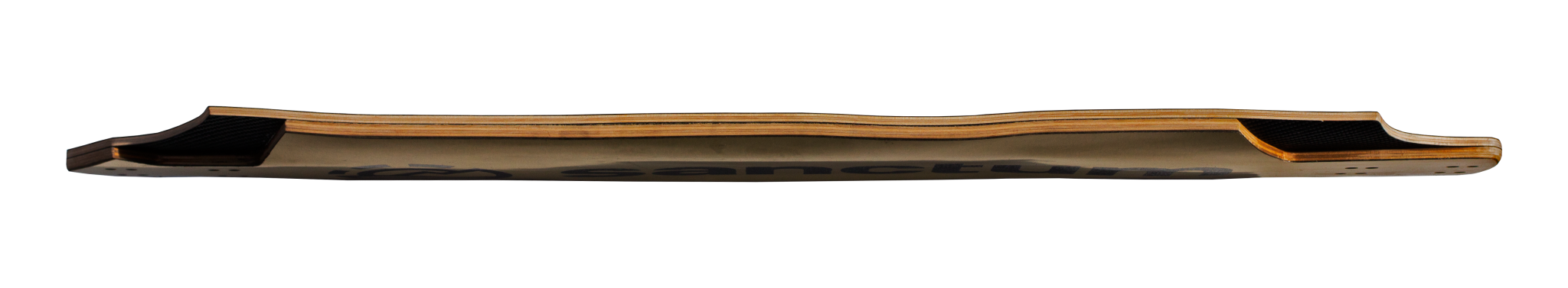 The construction is completely logical to the shape of the board. Keeping the presence of the wheel wells in mind, the engineers at Sanctum created the board in 2 sub-plies. The top sub-ply is the one with the top of the board, and the bottom is cut out before being pressed with the top to create flawless wheel well. There’s a layer of carbon fibre in between the sub-plies, creating a lightweight but stiff construction. Then there are plies of gold-dyed aluminum to sandwich the board, creating the namesake 24K construction.